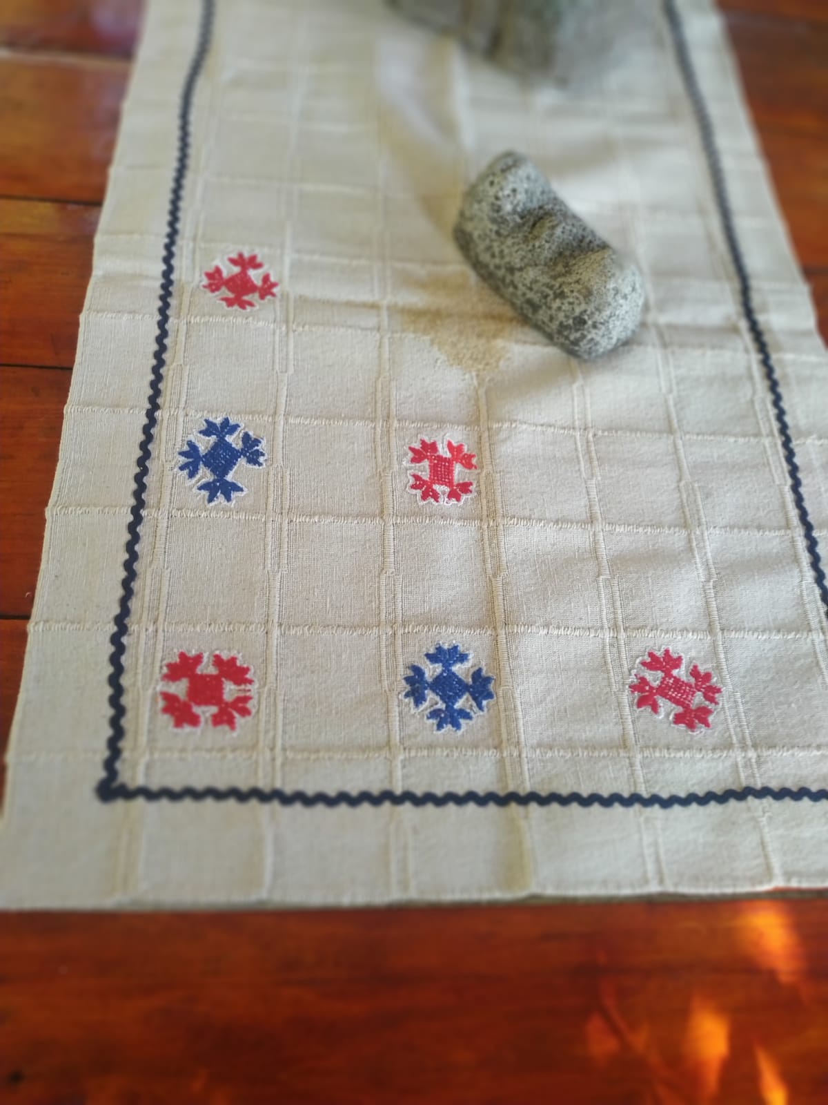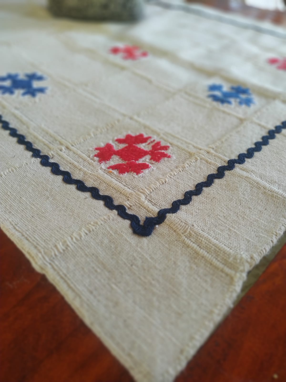 Kumaş keten kanaviçe monteleme kenar lacivert su tası calışılmıs runner, satısı mevcuttur