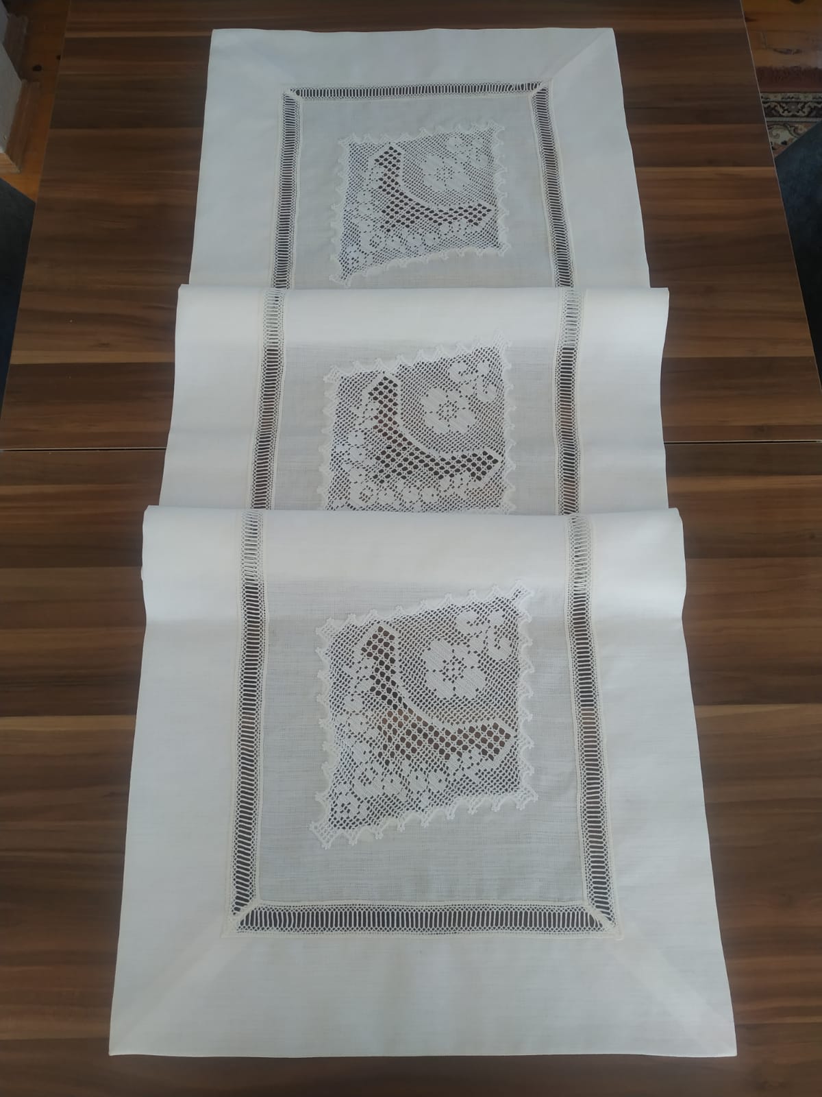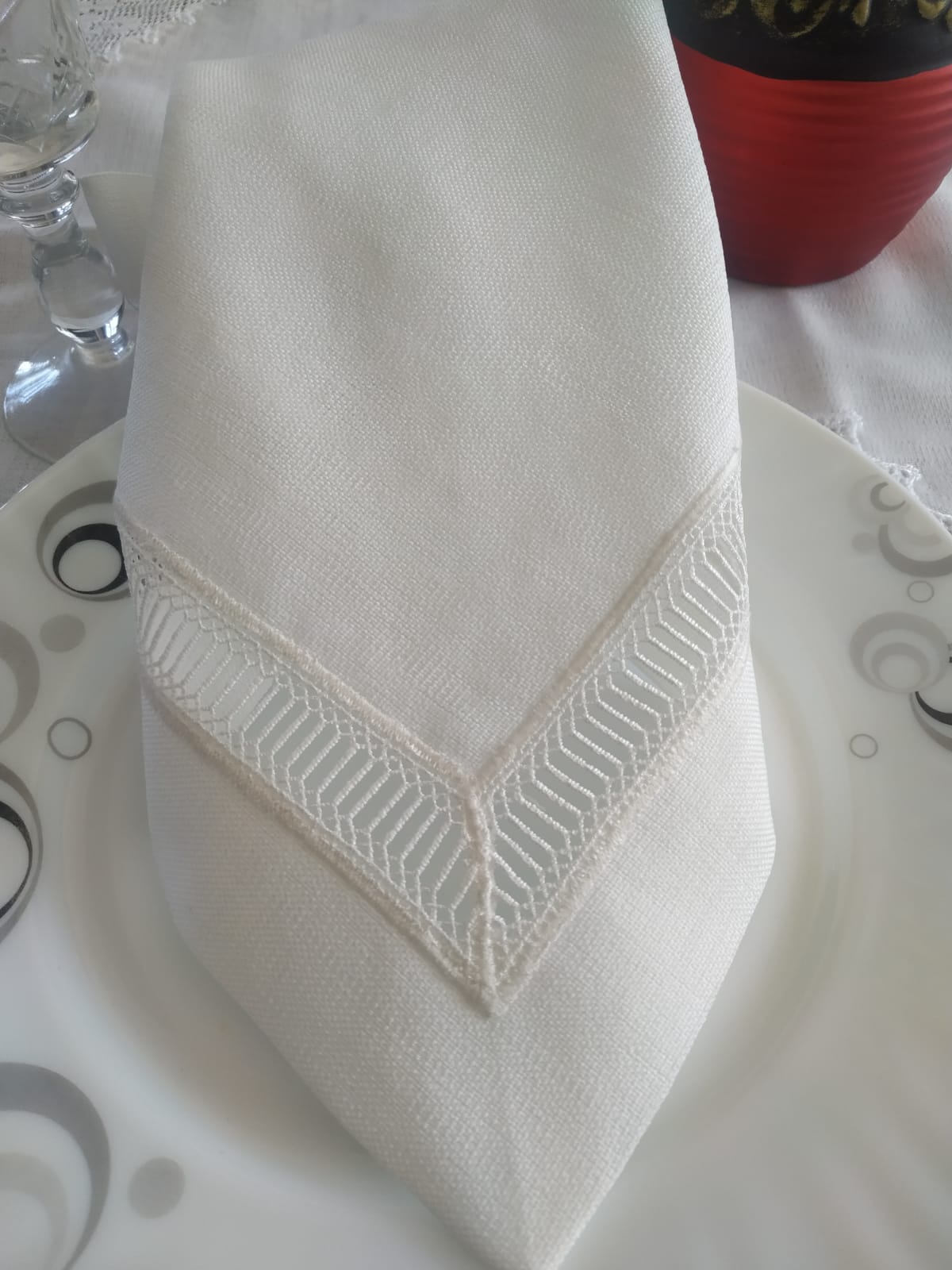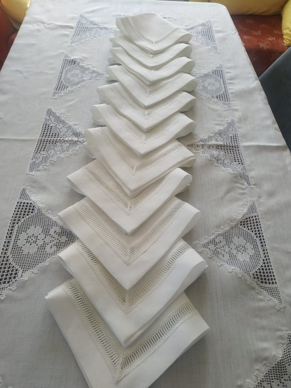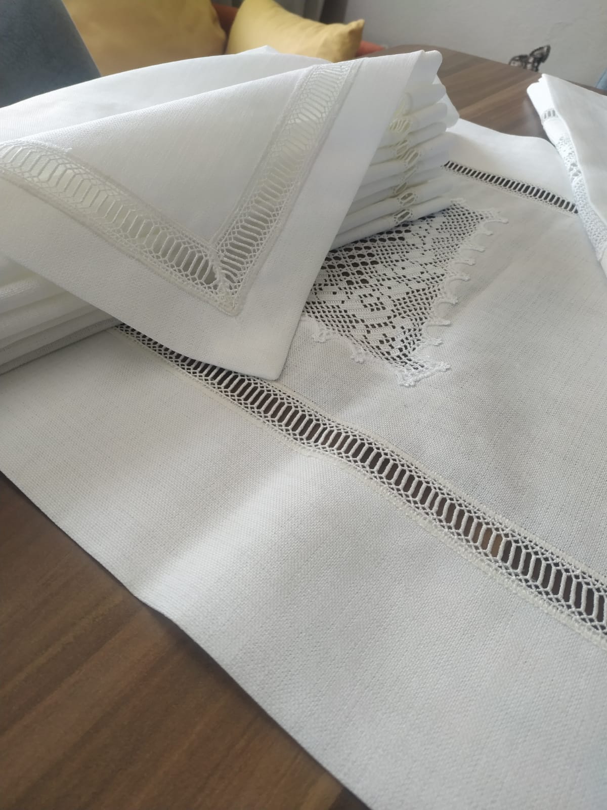 Masa grubu ve peçete gardenya kumaş el örgüsü dantel kolvel ile çalışılmıştır, çok emek isteyen bir işçiliği bulunmaktadır.